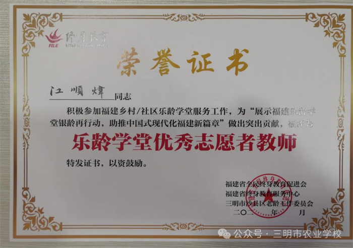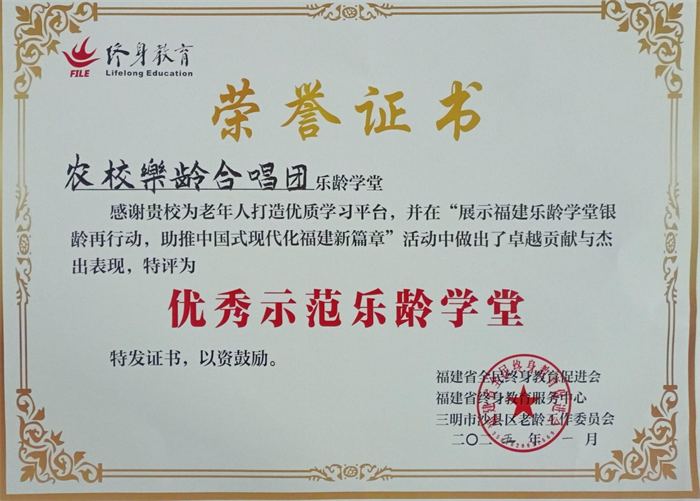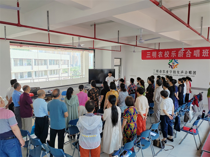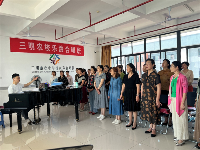 本支合唱团于2023年3月在三明农校开班,每周集中面授一次。合唱团自成立以来,秉持“以歌怡情,乐享生活”的宗旨,在江老师的专业指导下,团员们从音乐理论、声乐技巧、合唱排练等方面提升学习,已熟练掌握多首经典及原创曲目,尤其在和声处理、情感表达上达到了新高度。合唱团因出色的教学成效,于2025年1月获评福建省“优秀示范乐龄学堂”,江顺炜老师也获评福建省“乐龄学堂优秀志愿者教师”。