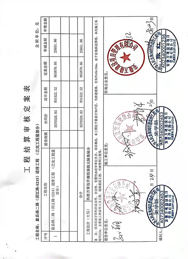 歙县扬二路(滨江路-S215)道排工程(已完工程量部分)程结算审核定案表