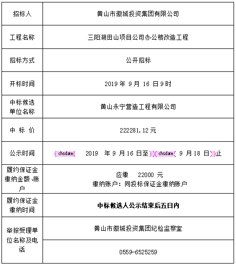 三阳湖田山项目公司办公楼改造工程 中标候选人公示