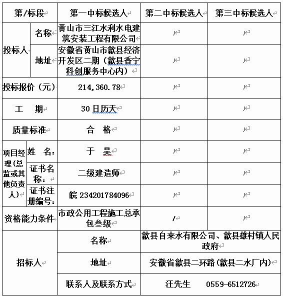 安徽华伟工程咨询有限公司受歙县自来水有限公司、歙县雄村镇人民政府的委托,对(HJSGC2020HWS001、歙县雄村镇雄村山斗组农饮水附属土建工程)进行(小型项目招标),本项目于(2020年3月02日)在(歙县自来水有限公司三楼会议室)开标、评标,现根据有关法律、法规要求,对中标候选人进行公示。