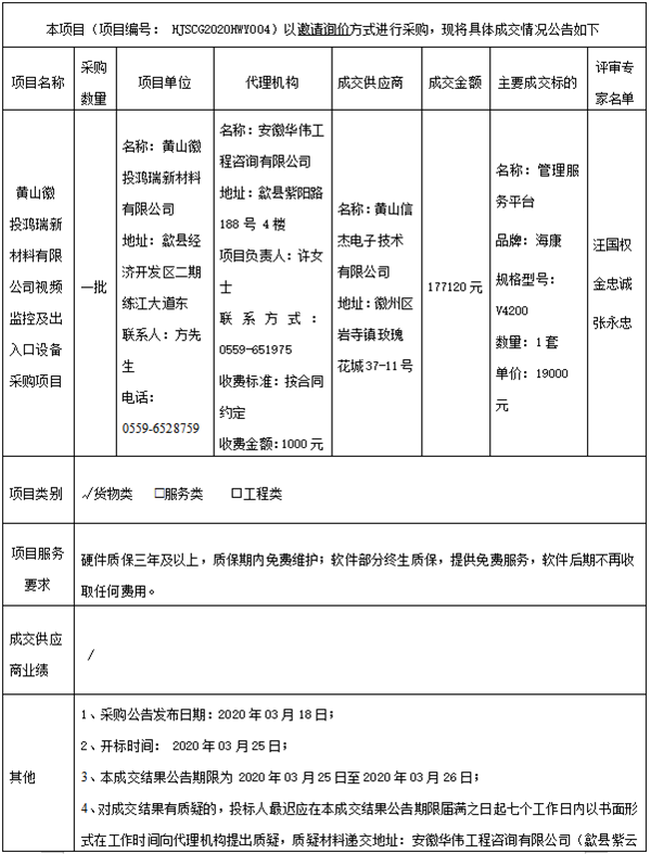 kaiyun·开云(中国)官方网站鸿瑞新材料有限公司视频监控及出入口设备采购项目成交结果公告