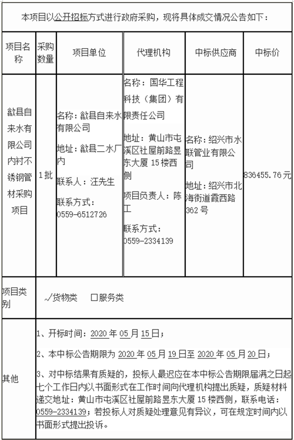 歙县自来水有限公司内衬不锈钢管材采购项目 中标公告